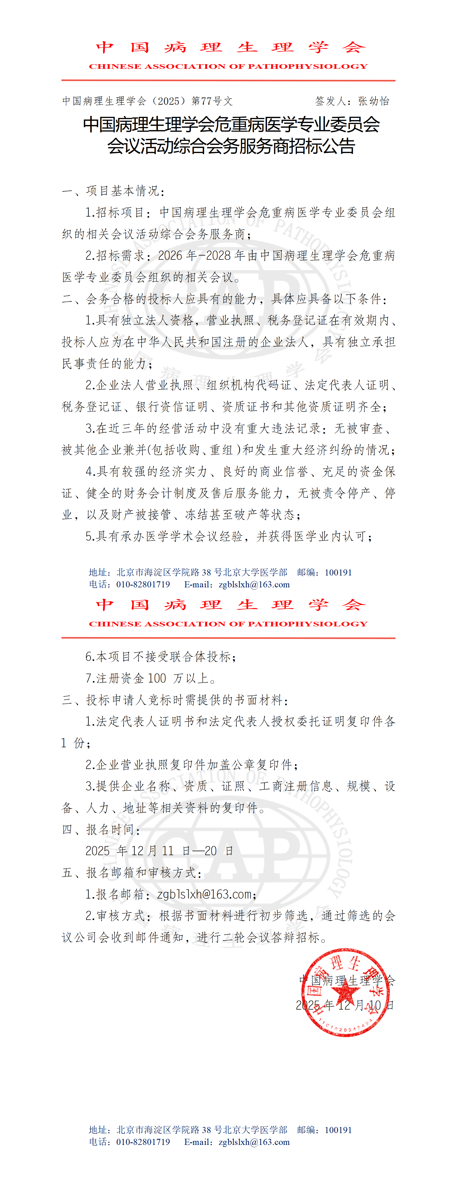 中国病理生理学会危重病医学专业委员会会议活动综合会务服务商招标公告